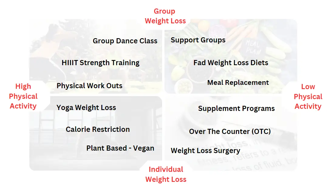 There are many methods to effective weight loss, they all claim to be the best and in fact to the right person the right program does work. BUT, the question is which is the right weight loss program for you? Real success for you is in selecting the right method for you? Selecting the type of program that best meets your style and your personality? The following are the some of the more popular weight loss programs but you can see how each falls into diferent part of a chart. Are you an extovert or an introvert? Do you prefer group settings or working out alone?